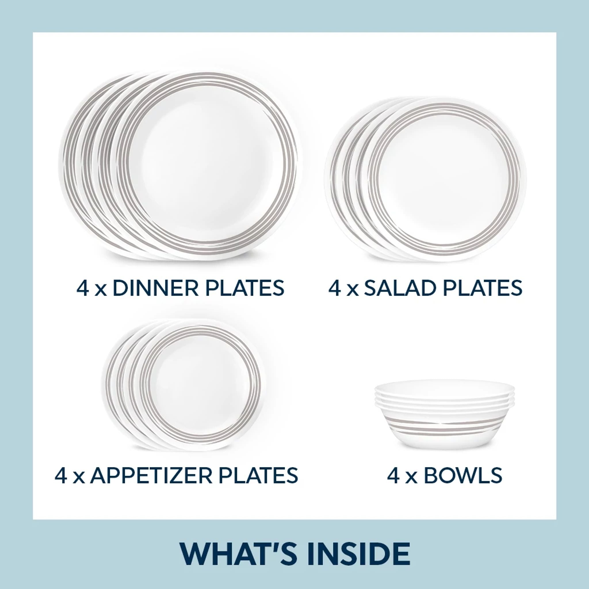 Be the first to review “Corelle Brushed Silver 16-piece Dinnerware Set. Service for 4” Cancel reply