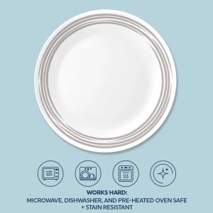 Silvery-grey brushstroke bands circle the rim of these bright white plates. for a distinctive dinnerware set. Casual enough for everyday meals with the family. it dresses-up beautifully for a special dinner with friends.